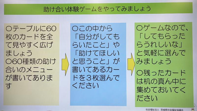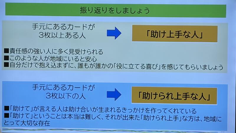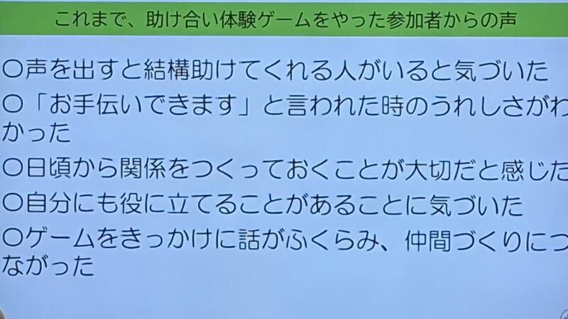 みんなのまちづくり専門コース(第9回) 投稿日時 : 01/28 山百合 自分たちの地域福祉活動を考える 茨城県社会福祉協議会 参事 中山栄一 【講師によるグループワークの提案です。】6名くらいのグループをつくります。 助け合い体験ゲーム 各々選んだ3枚の「助けてほしいと思うこと」カード 次はグループ内で、助けてくれると引き受けてくれた人にそのカードを渡します。 それぞれ自分で出来そうなことを考えます。手元にカードは有りますか? とても興味深いゲームです。 Tweet {{options.likeCount}} {{options.likeCount}} {{options.unlikeCount}} {{options.unlikeCount}}